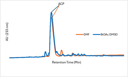Figure 1 provides an HPLC overlay comparing peptide ACP synthesized under default DMF conditions (orange) and using 7:3 BtOAc:DMSO with reduced washes (blue).