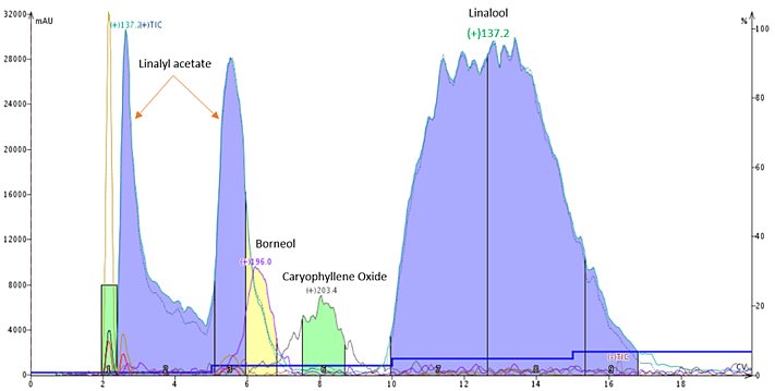 In the case of the hexane/ethyl acetate gradient, borneol (detectable m/z 196) co-elutes with linalyl acetate (detectable m/z 137) but caryophyllene oxide (detectable m/z 203) is partially resolved. The other main terpenoid, linalool (detectable m/z 137), is fully separated, Figure 6.