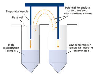 Evaporation is a key step in the sample preparation workflow, either to concentrate analyte of interest or to exchange a solvent for one more compatible with the subsequent analytical technique. Sample extracts are typically collected in a 96-well collection plate and for evaporation are processed under a controlled flow of air or nitrogen. Sample cross-contamination or ‘crosstalk’ occurs when analytes are carried out with the volatilized solvents, as depicted in Figure 1.