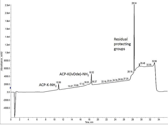Figure 1: Analytical HPLC of crude ACP-K(ivDde) confirming successful synthesis and incorporation of ivDde protected Lys.