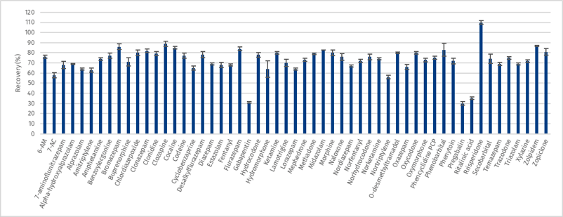 Figure 1. Recovery of analytes obtained from 100 µL of human breast milk spiked at 25 ng/mL. %RSD shown as error bars (n=5).