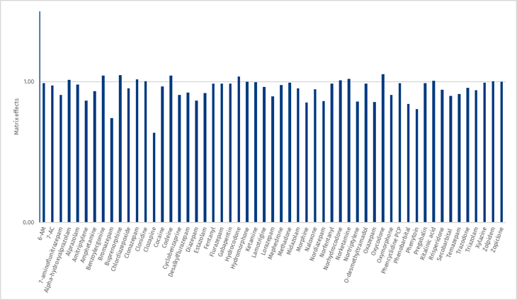 6-AM, 7-AC, 7-aminoflunitrazepam, Alpha-hydroxyalprazolam, Alprazolam, Amitriptylene, Amphetamine, Benzoylecgonine, Bromazepam, Buprenorphine, Chlordiazepoxide, Clonazepam, Clonidine, Clozapine, Cocaine, Codeine, Cyclobenzaprine, Desalkylflurazepam, Diazepam, Estazolam, Fentanyl, Flurazepam, Gabapentin, Hydrocodone, Hydromorphone, Ketamine, Lamotrigine, Lorazepam, Mephedrone, Methadone, Midazolam, Morphine, Naloxone, Nordiazepam, Norfentanyl, Norhydrocodone, Norketamine, Nortriptylene, O-desmethyltramadol, Oxazepam, Oxycodone, Oxymorphone, Phencyclidine PCP, Phenobarbital, Phenytoin, Pregabalin, Ritalinic acid, Risperidone, Secobarbital , Temazepam, Trazodone, Triazolam, Xylazine, Zolpidem, Zopiclone