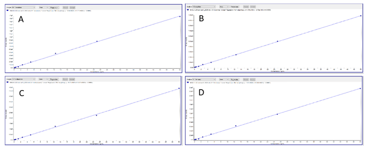 Figure 3. Representative calibration curves for A) Trazodone, B) Morphine, C) Nordiazepam, and D) Fentanyl.