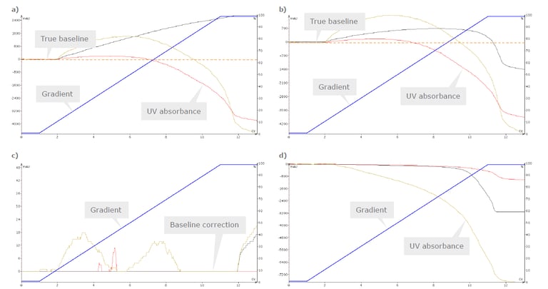 Isolera™ Spektra purification instruments provide an alternate automated in-system means of dealing with absorbing solvents. Isolera™ Spektra is an advanced software package, designed to work with Isolera™ family of purification instruments to further enhance the functionality. One of its key features is the elimination of baseline drift, based on solvent absorptions. The purification chemist only needs to load the purification column and run samples as normal. When selecting ‘Baseline Correction’ in the software, the system automatically takes care of the whole process. Isolera™ Spektra systems will first create a real baseline based on the actual solvent/gradient composition intended in the purification run, hold it in memory and then subtract it when the purification occurs (Figure 2b). This real baseline correction is far more accurate and reliable than other systems which may use calculations and algorithms, as it samples the actual solvent to be used for the purification, rather than arbitrarily applying a theoretical list to a real life comparison.