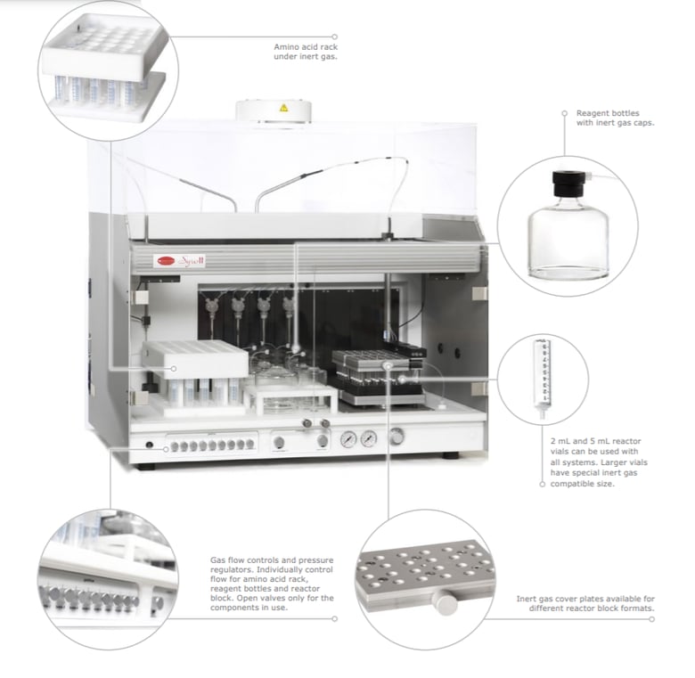 Syro XP software manages all system functions automatically calculating amino acid and reagent requirements. Each synthesis cycle can follow a unique protocol, enabling single or multiple couplings and full freedom in selecting coupling strategies.